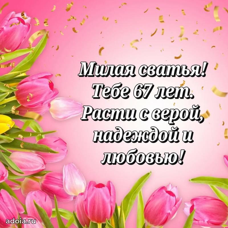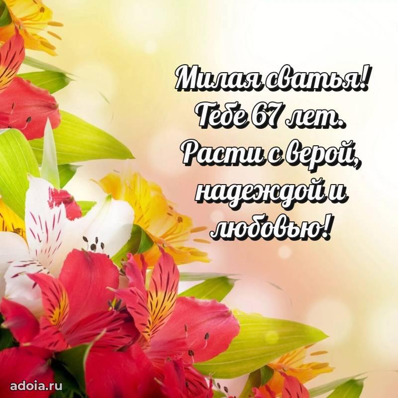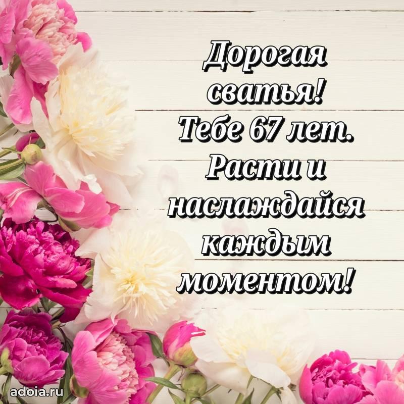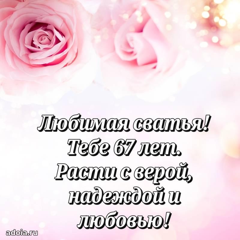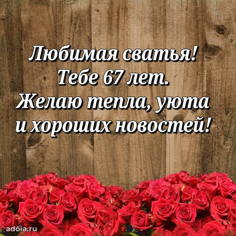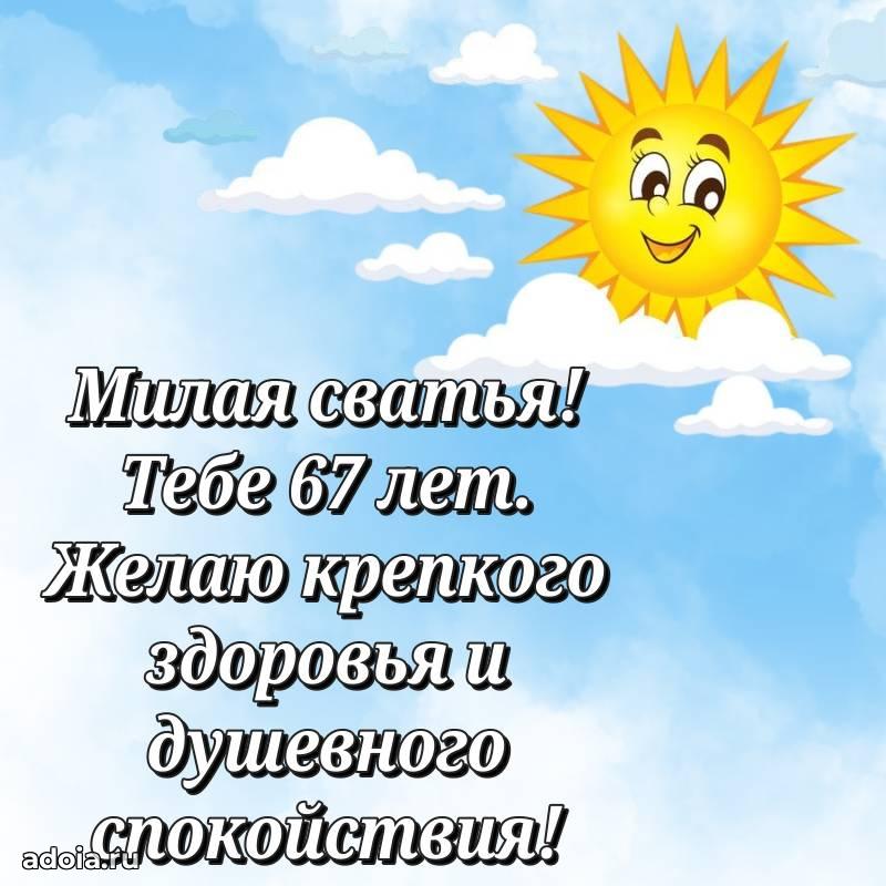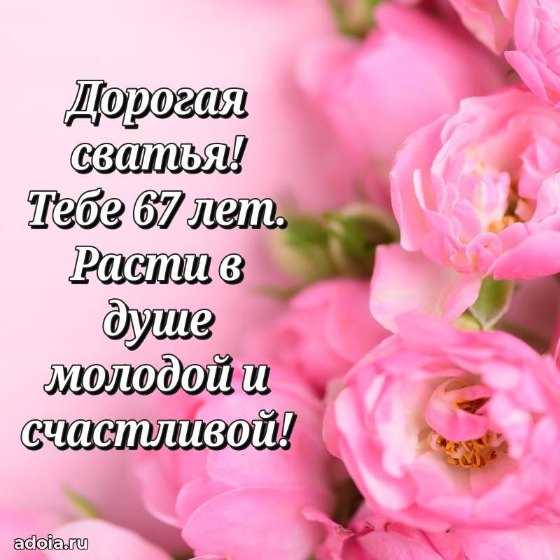 В поисках красивых и современных открыток? Вы попали по адресу! Здесь вы найдете картинки с днем рождения Сватье на 67 лет! Все картинки в высоком качестве, которые можно скачать или отправить через WhatsApp бесплатно. Также вы найдете много прикольных и мерцающих гифок и анимаций, которые поднимут настроение! Все открытки содержат поздравления в стихах и прозе.