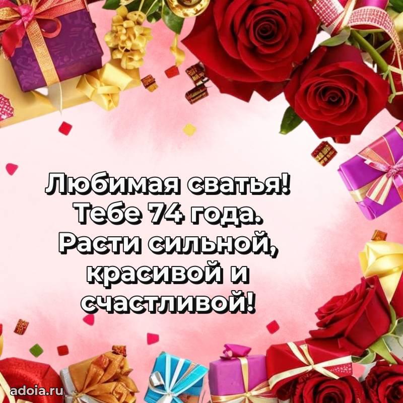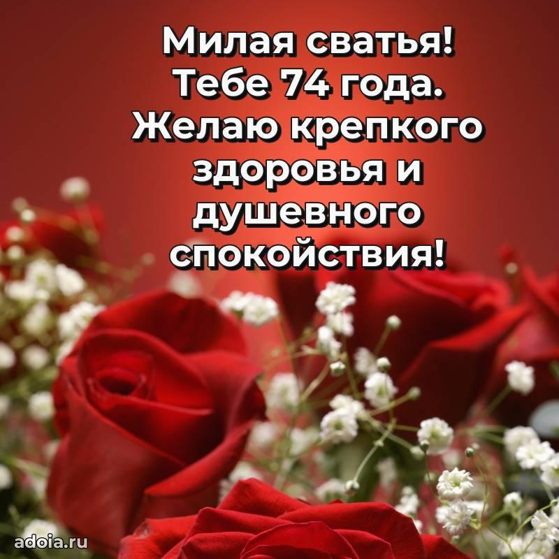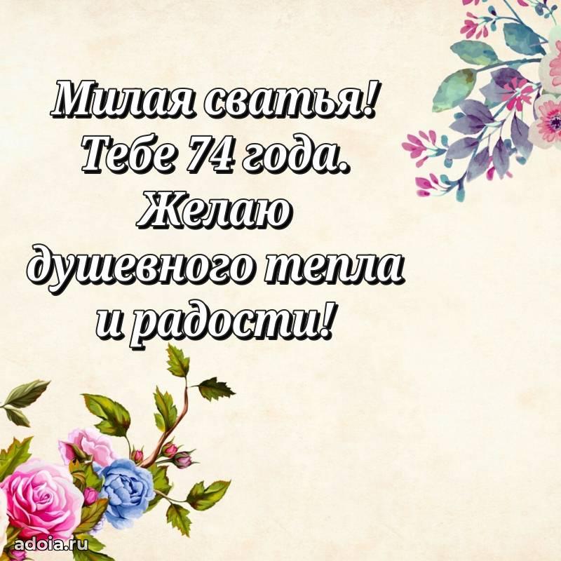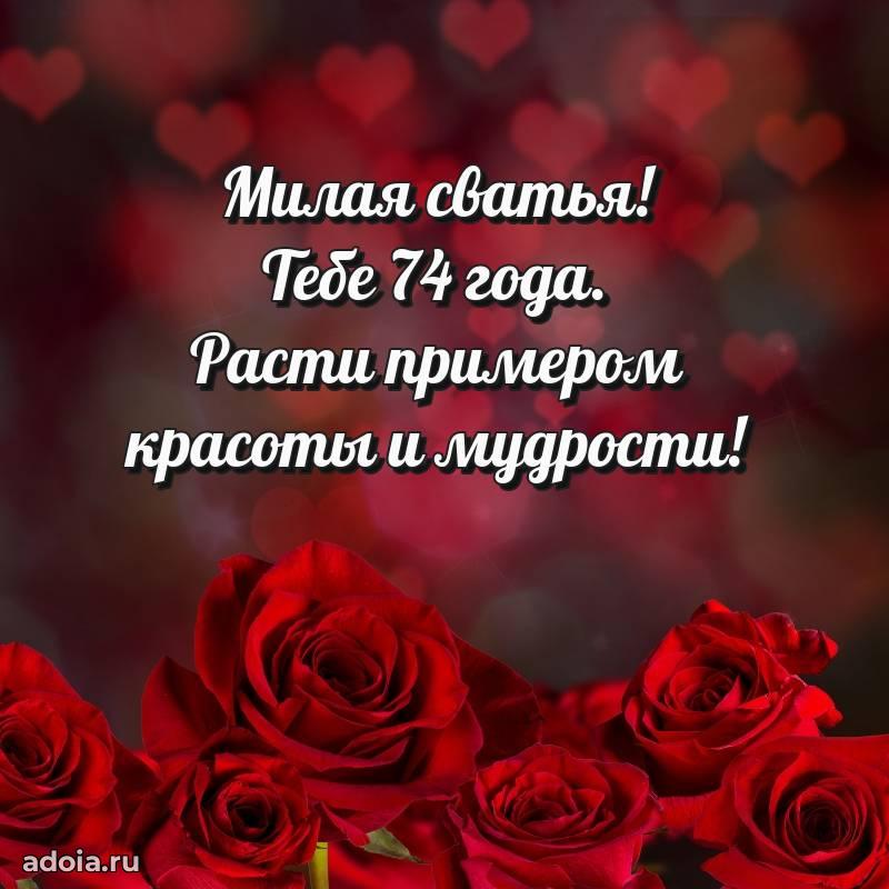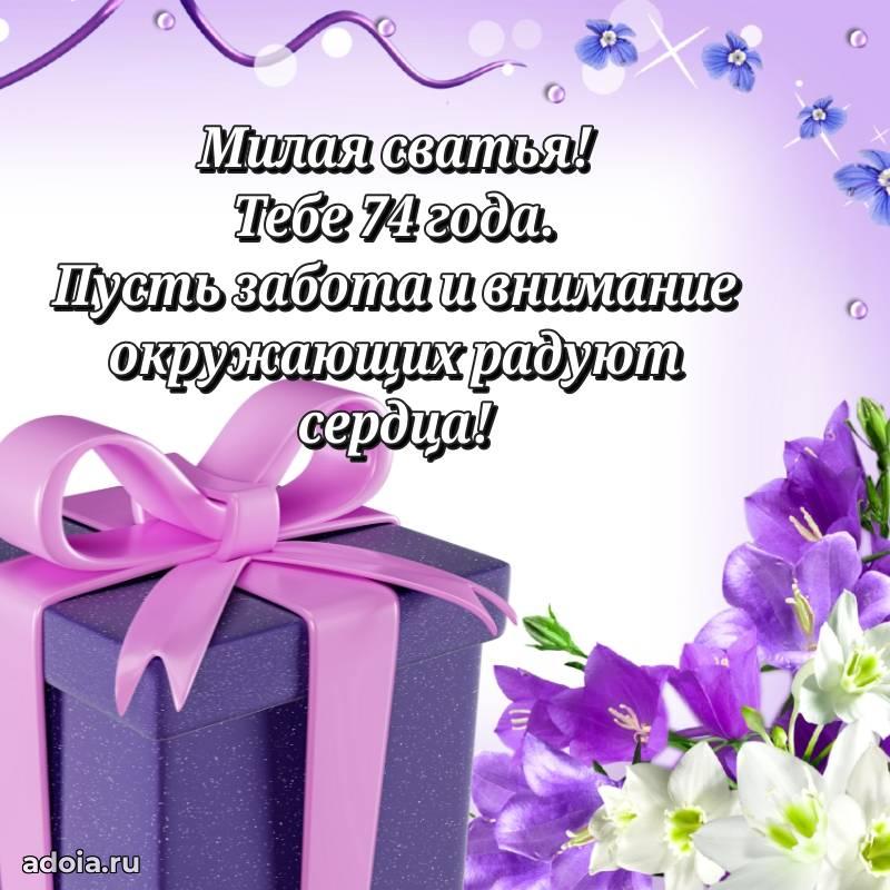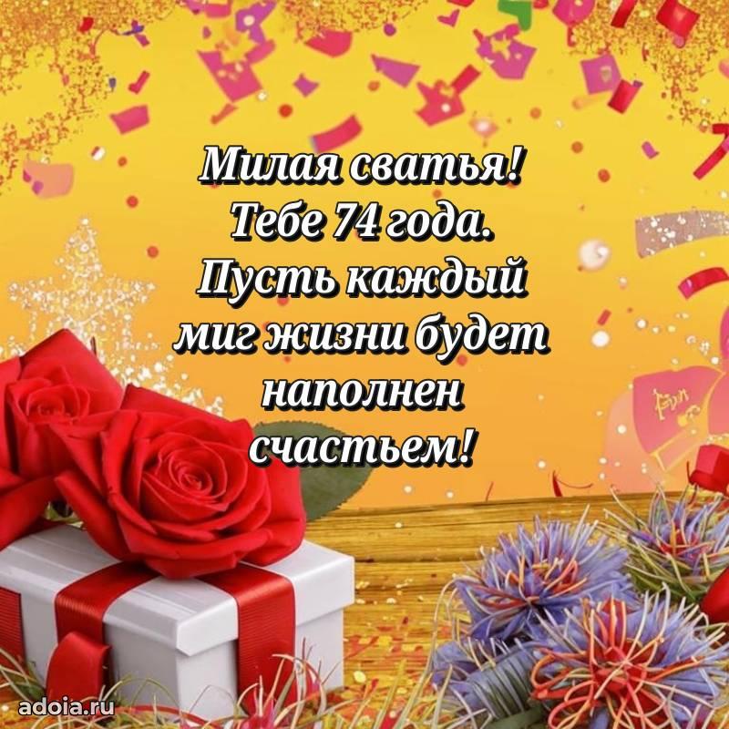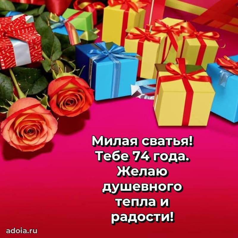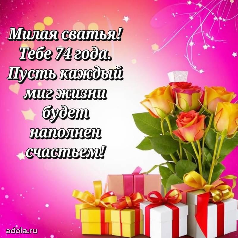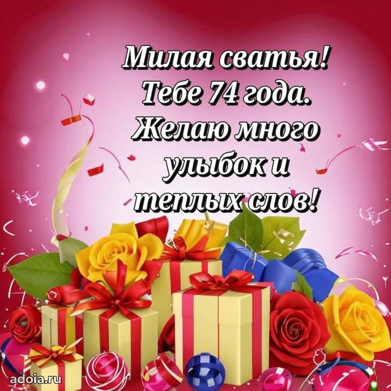 В поисках красивых и современных открыток? Вы попали по адресу! Здесь вы найдете картинки с днем рождения Сватье на 74 года! Все картинки в высоком качестве, которые можно скачать или отправить через WhatsApp бесплатно. Также вы найдете много прикольных и мерцающих гифок и анимаций, которые поднимут настроение! Все открытки содержат поздравления в стихах и прозе.