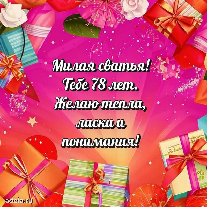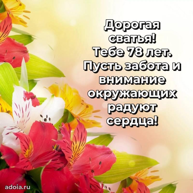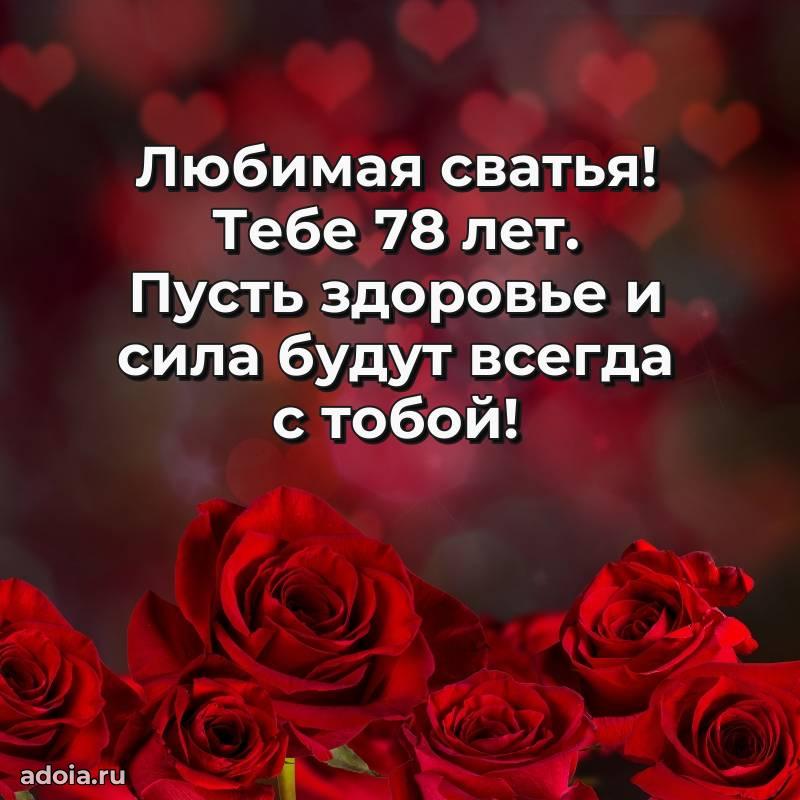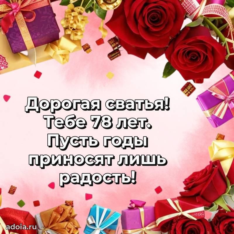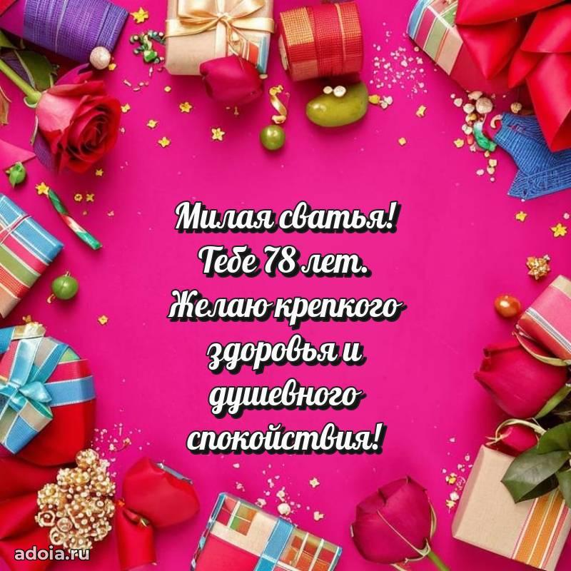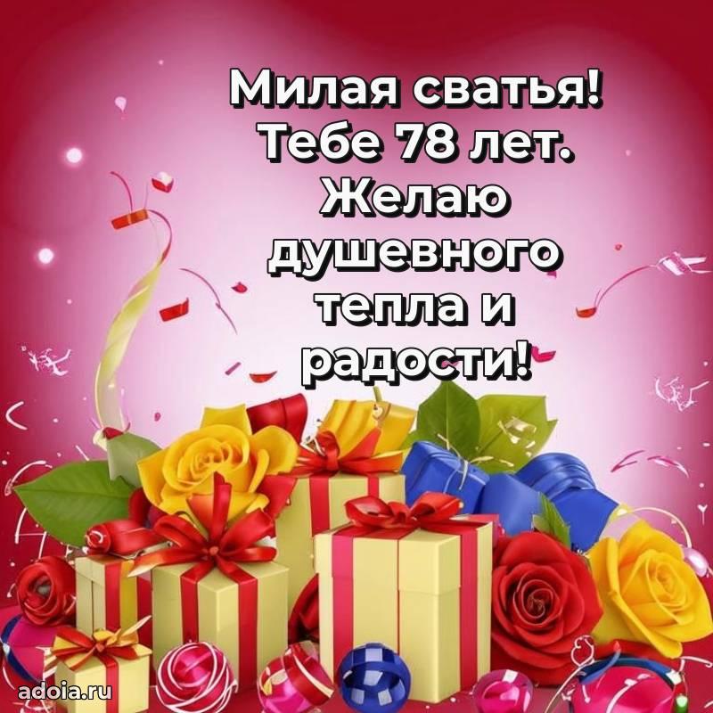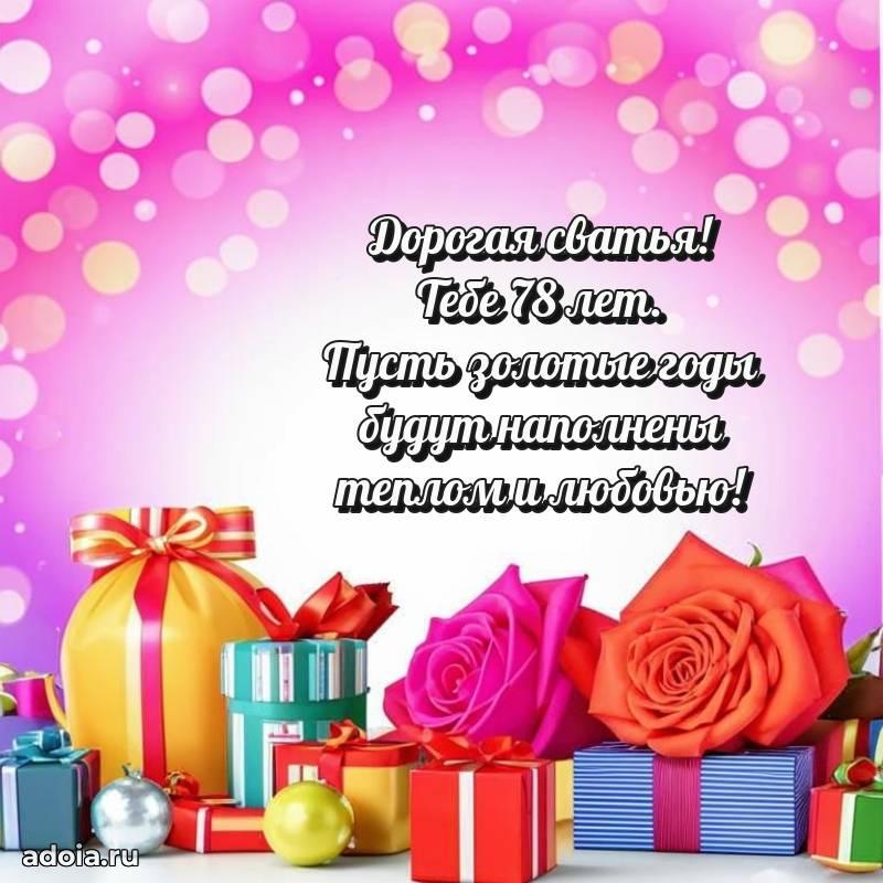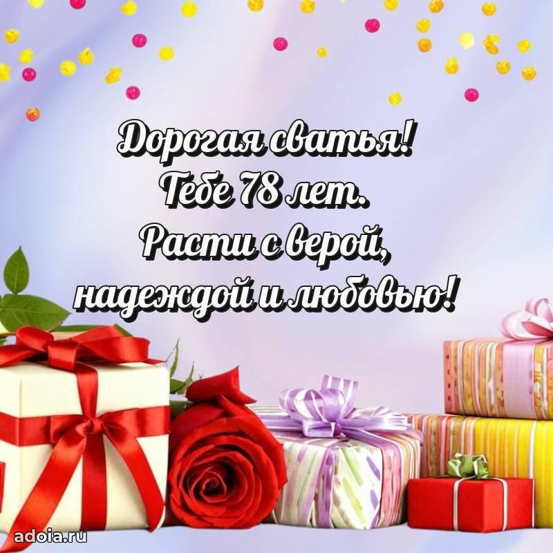 В поисках красивых и современных открыток? Вы попали по адресу! Здесь вы найдете картинки с днем рождения Сватье на 78 лет! Все картинки в высоком качестве, которые можно скачать или отправить через WhatsApp бесплатно. Также вы найдете много прикольных и мерцающих гифок и анимаций, которые поднимут настроение! Все открытки содержат поздравления в стихах и прозе.