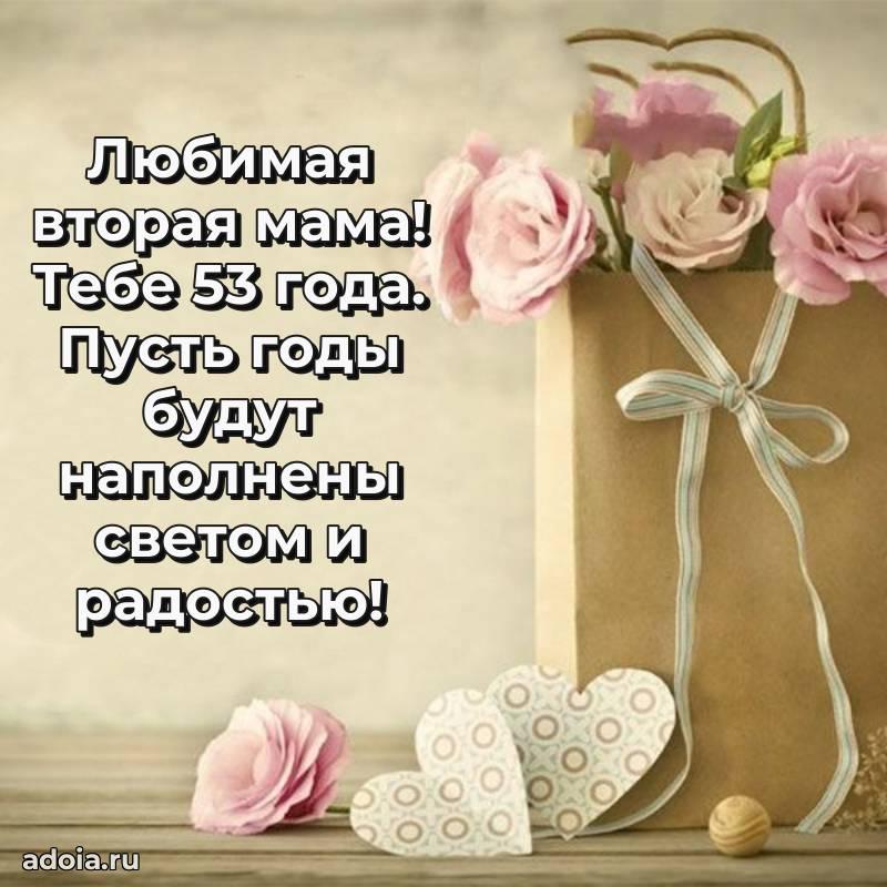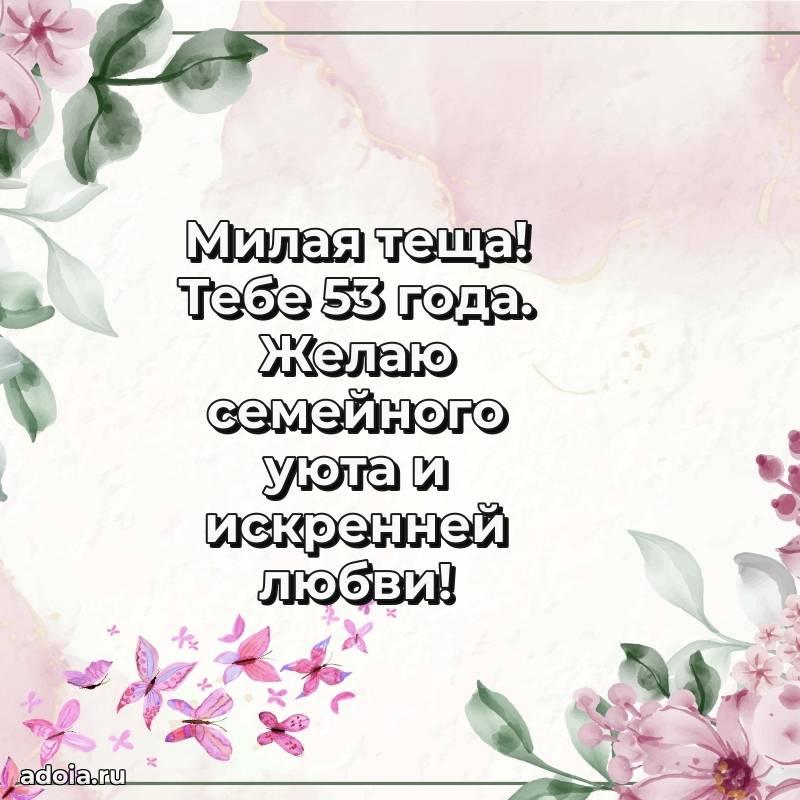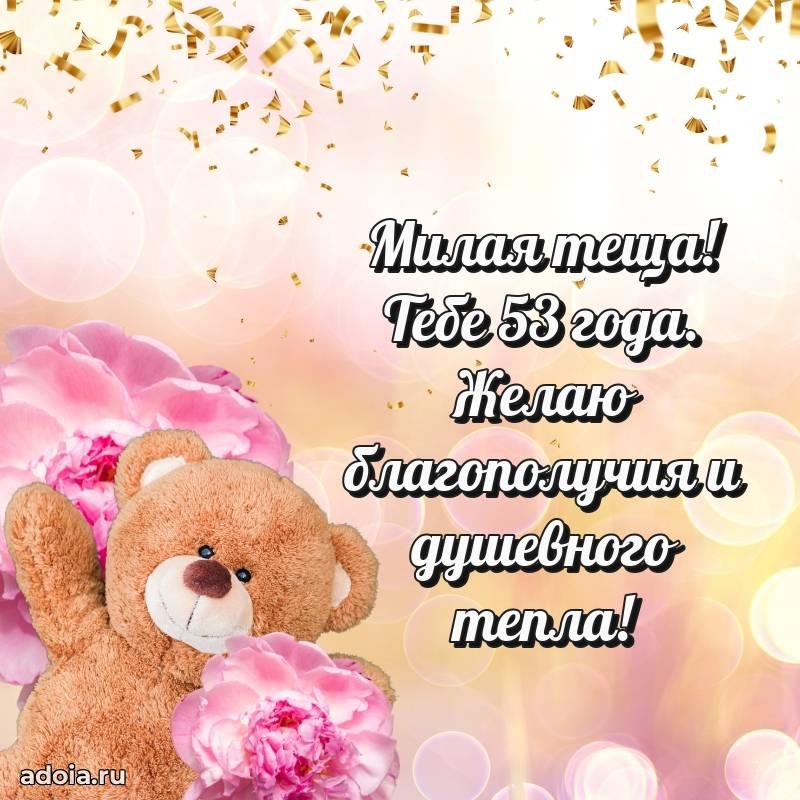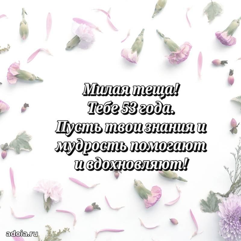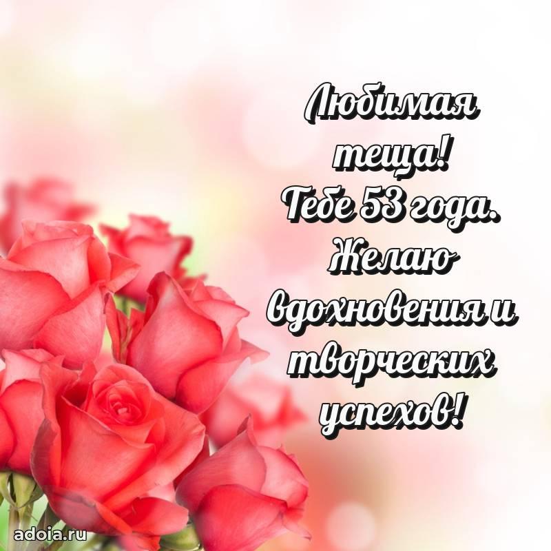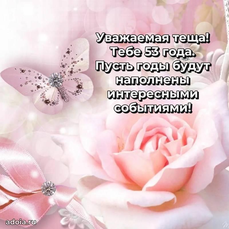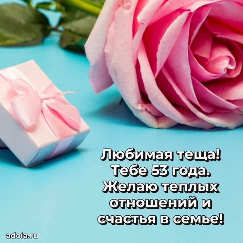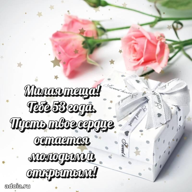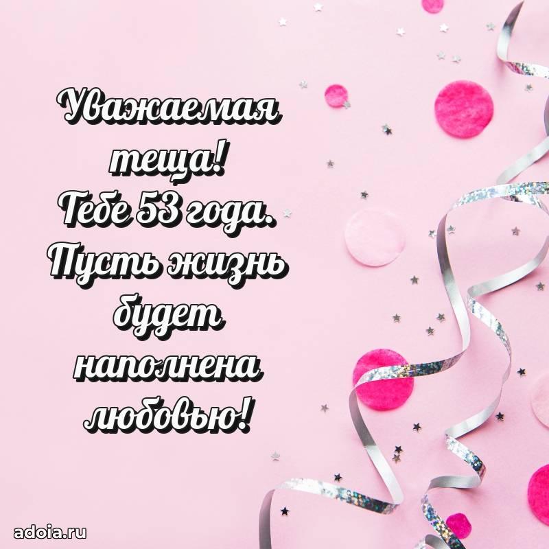 В поисках красивых и современных открыток? Вы попали по адресу! Здесь вы найдете картинки с днем рождения Тещe на 53 года! Все картинки в высоком качестве, которые можно скачать или отправить через WhatsApp бесплатно. Также вы найдете много прикольных и мерцающих гифок и анимаций, которые поднимут настроение! Все открытки содержат поздравления в стихах и прозе.
